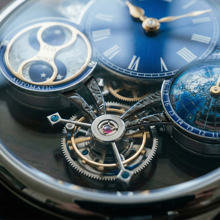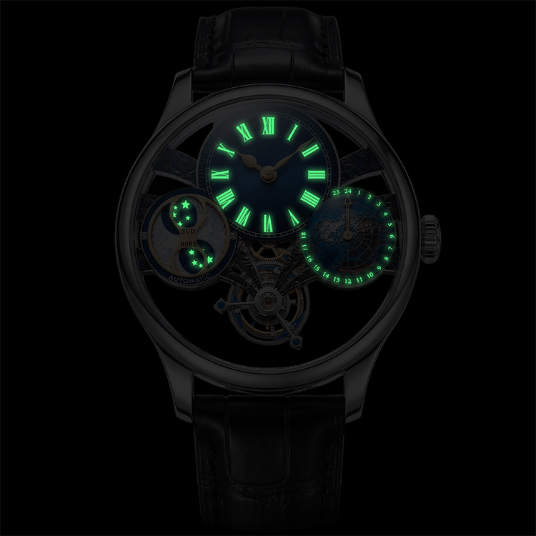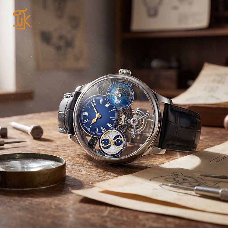 The Triple Complication Skeleton Watch combines openwork mechanics with practical timekeeping features. As a result, it offers a mechanical watch that looks distinctive while remaining easy to read and comfortable for daily use.