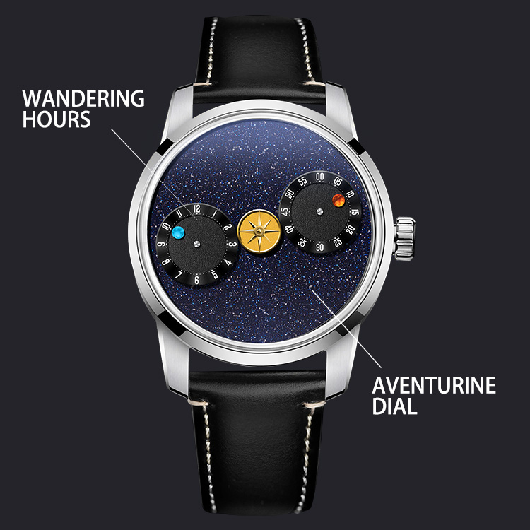 Step into a miniature universe where time orbits like planets in the silent vastness of space. The Celestial Wanderer Aventurine Watch reimagines horology as a celestial ballet, blending innovative wandering-hour mechanics with the infinite allure of the stars.