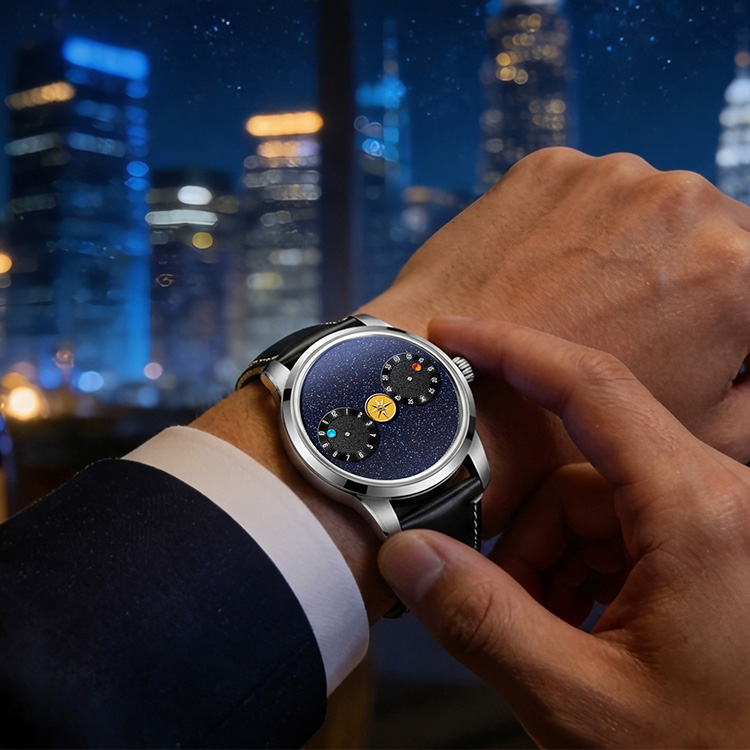 The Celestial Wanderer is more than a luxury blue goldstone wandering hour mechanical watch—it’s your wearable solar system, where time orbits with celestial precision and wonder.