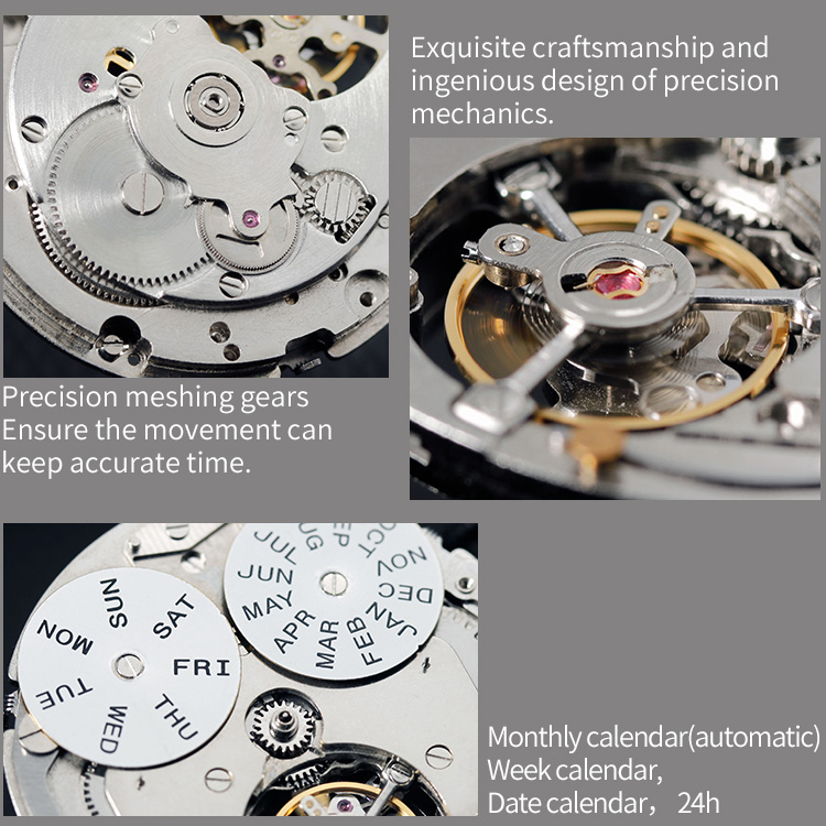 With years of expertise, we unveil a versatile marvel: a multifunctional mechanical watch movement. Featuring a 24-hour indicator, month, week, and date calendars, with a 6 o’clock balance wheel.