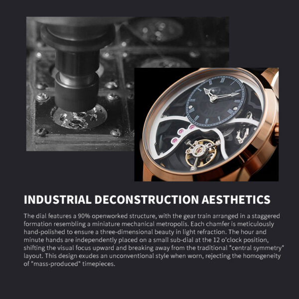 At 12 o’clock, a black open-work sub-dial adorned with Roman numerals exudes a refined vintage charm. Slender, gracefully shaped hands sweep across the face, their elegance a nod to the artistry of classical watchmaking. Beneath and around this focal point, a wide expanse of skeletonization reveals the heartbeat of the watch—golden gears turning in harmony, mainsprings coiled with quiet strength, and ruby jewel bearings glowing like embers against a backdrop of polished metal.
