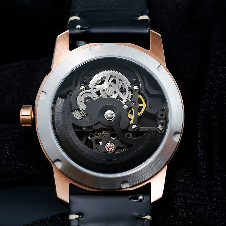 This mechanical showcase is housed in a round rose gold PVD stainless steel case, its warm tones and highly polished bezel creating a sophisticated, light-reflective frame. The harmonious contrast between the case’s luxurious finish and the exposed structural geometry achieves a perfect balance of elegance and technical strength.