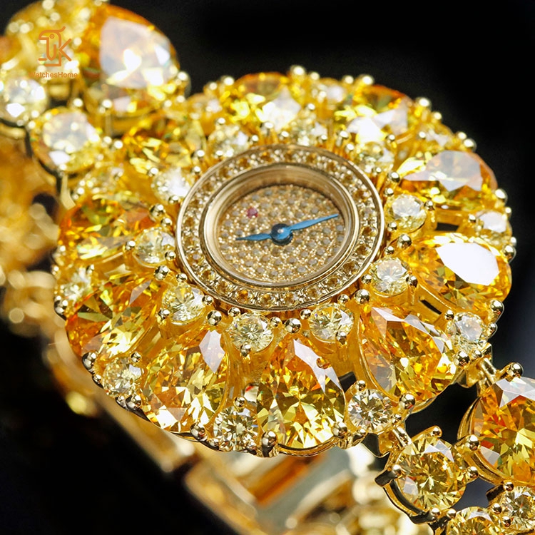 Crafted with 18K yellow gold, both the case and bracelet exude luxury and sophistication. Adorned with lustrous yellow gemstones and sparkling white diamonds, they create a stunning visual display that catches the eye.