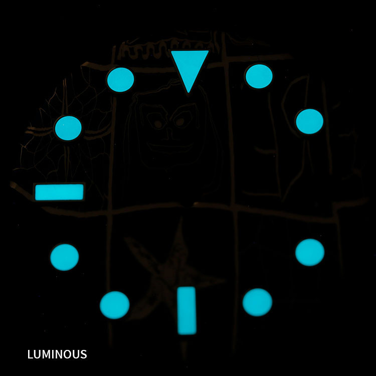 Titanium offers exceptional lightness by nature. Moreover, we refine our Damascus process further to make the dial remarkably featherweight. We apply a soft matte finish to the graffiti areas. Therefore, this treatment preserves delicate hand-painted details while eliminating glare for easy readability. For example, we embed only minimalist white bar markers—no excess decoration. As a result, your eyes always focus directly on the captivating canvas of forged fire and rebellious art.