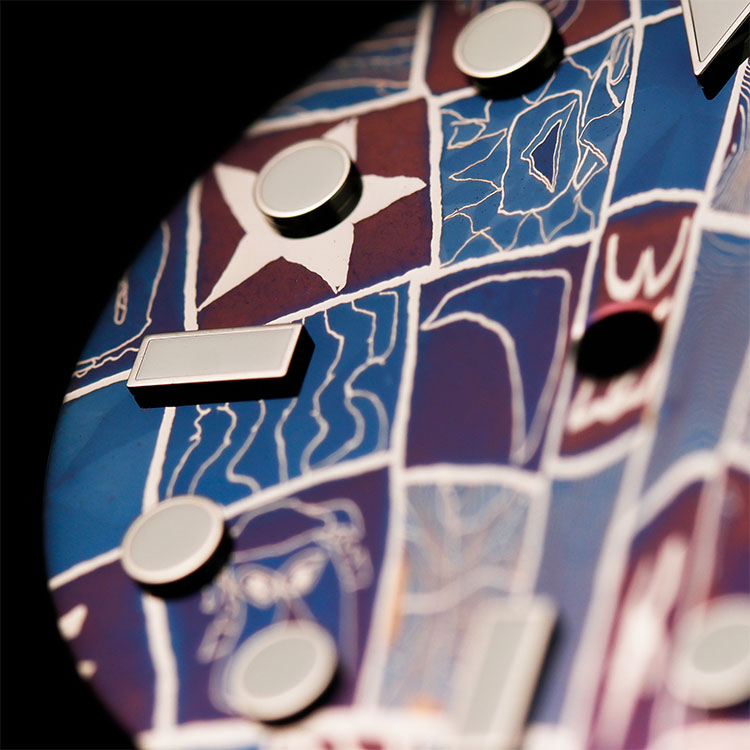 We craft each Damascus titanium graffiti dial through an intense blend of fire and skill. First, we fold pure titanium layers repeatedly. Then, we quench them in open flames with traditional forging methods. As a result, the metal flows and reshapes under extreme heat. This process creates unique, organic wave patterns—a lighter, stronger, and fully corrosion-resistant evolution of classic Damascus steel. Next, our artists hand-paint free-spirited graffiti motifs on the surface, including bold street-style strokes and literary-inspired symbols. Consequently, these elements merge with the forged textures. Thus, they spark a vibrant yet restrained artistic energy.