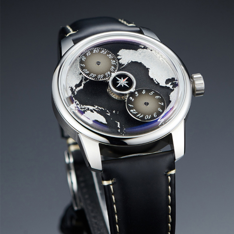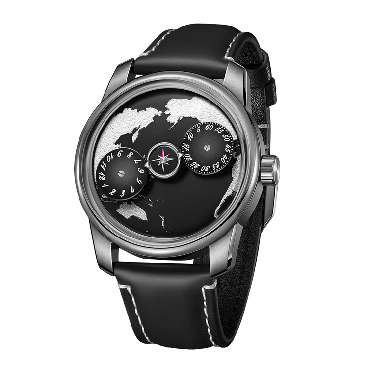 The deep black dial is a canvas of wanderlust: a crisp white world map contours its surface, evoking the thrill of uncharted horizons. Framed by sleek stainless steel, the watch exudes timeless elegance, complemented by a supple black leather strap that balances ruggedness with refinement.