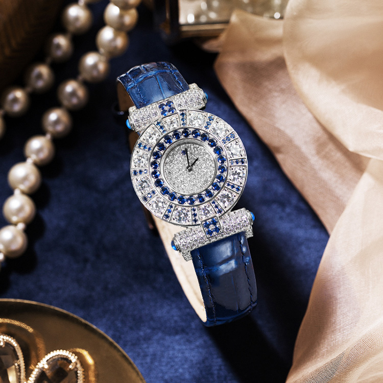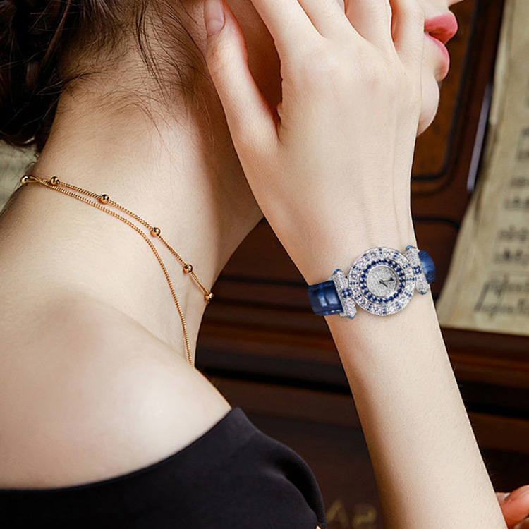 The dial is adorned with shimmering white gemstones, complementing the overall design. With a two-hand movement, the watch embodies simplicity and grace. The Italian leather strap not only adds a touch of sophistication but also offers excellent waterproof performance.