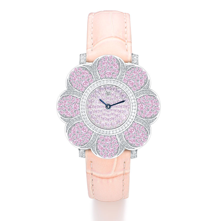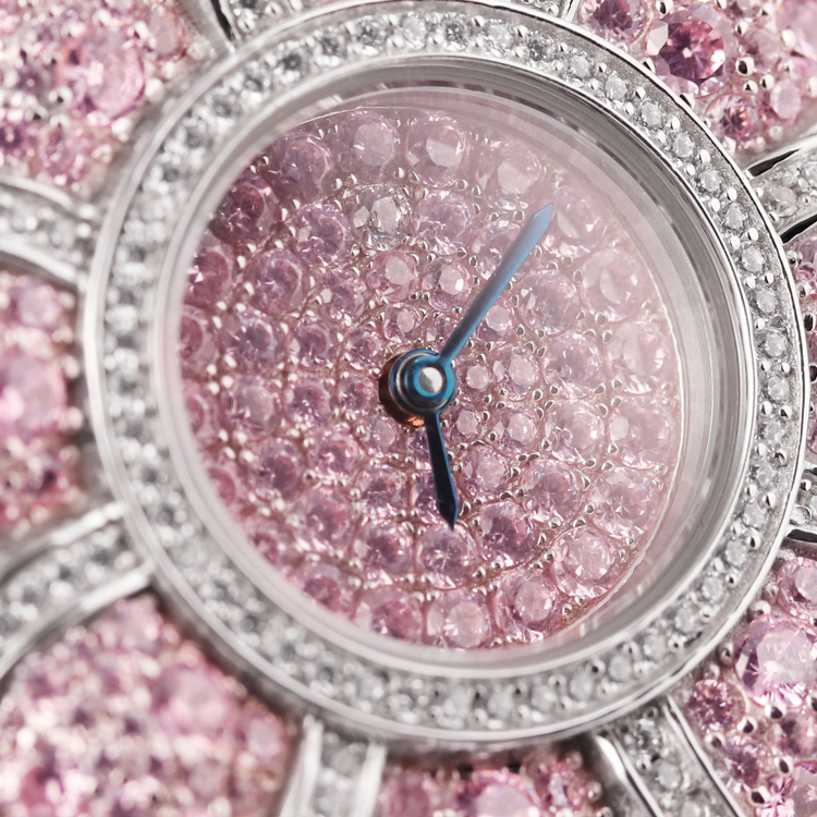 The dial is a masterpiece, adorned with exquisite pink gemstones, while the noble blue hour and minute hands accentuate its refined beauty. The Italian pink leather strap adds a touch of sophistication and elegance to this timepiece.