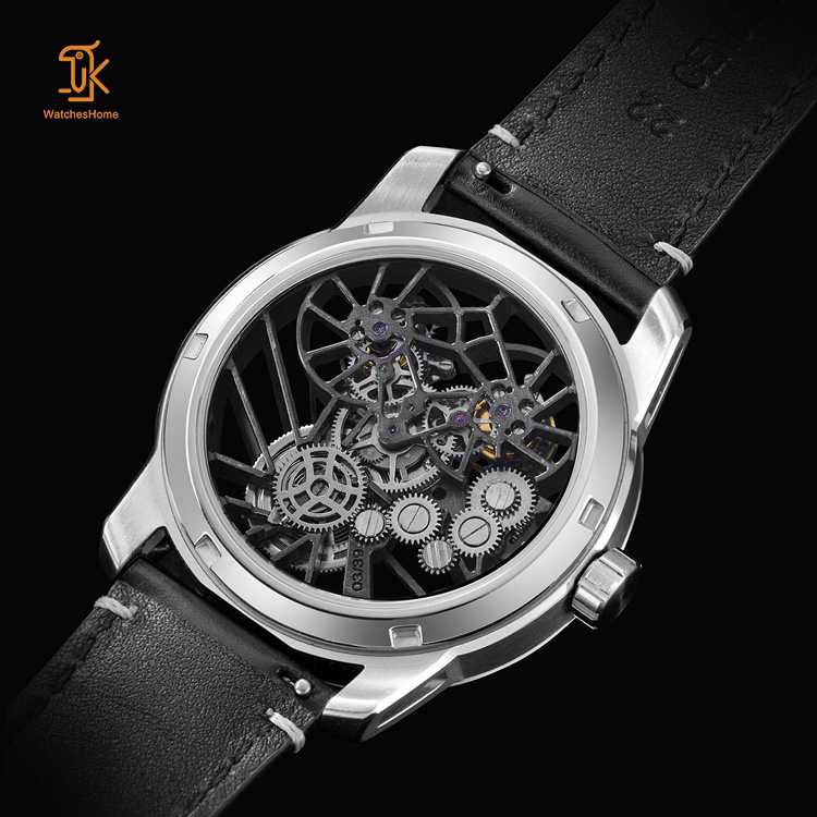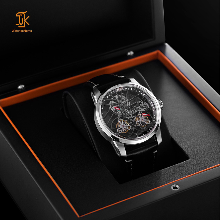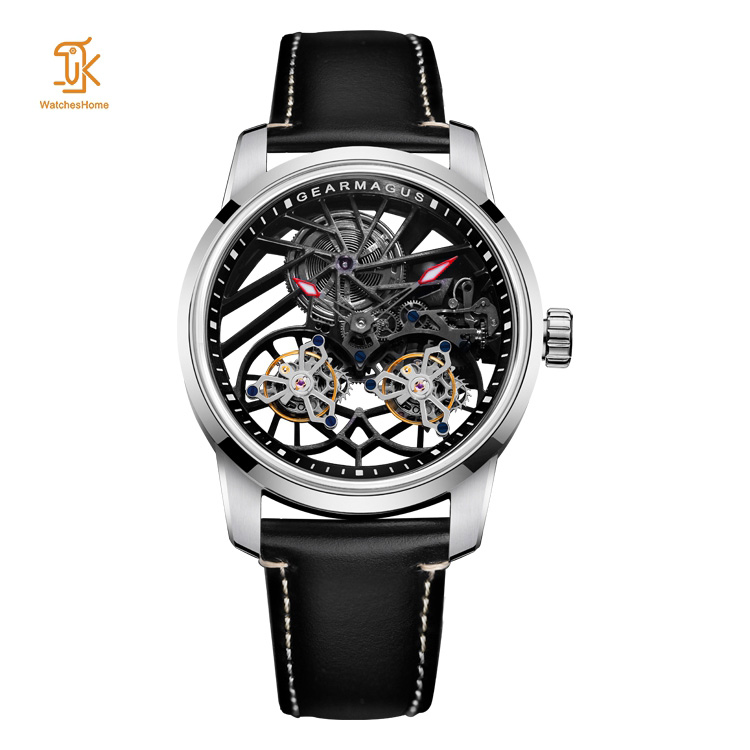 This double tourbillon mechanical watch features a stunning see-through base design. The transparent bottom cover lets you admire the exquisite movement and customize the brand logo to your liking. The customized strap blends the white case with the black dial, combining elegance and fashion seamlessly.