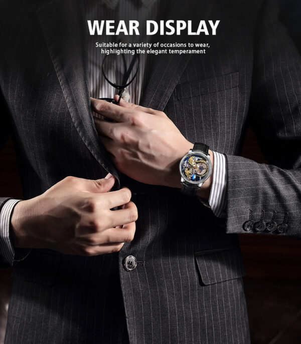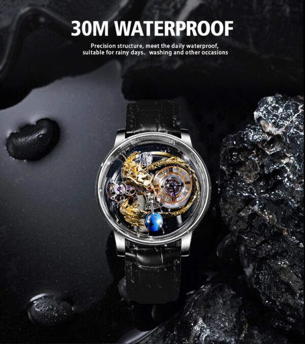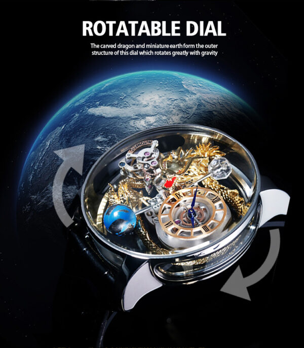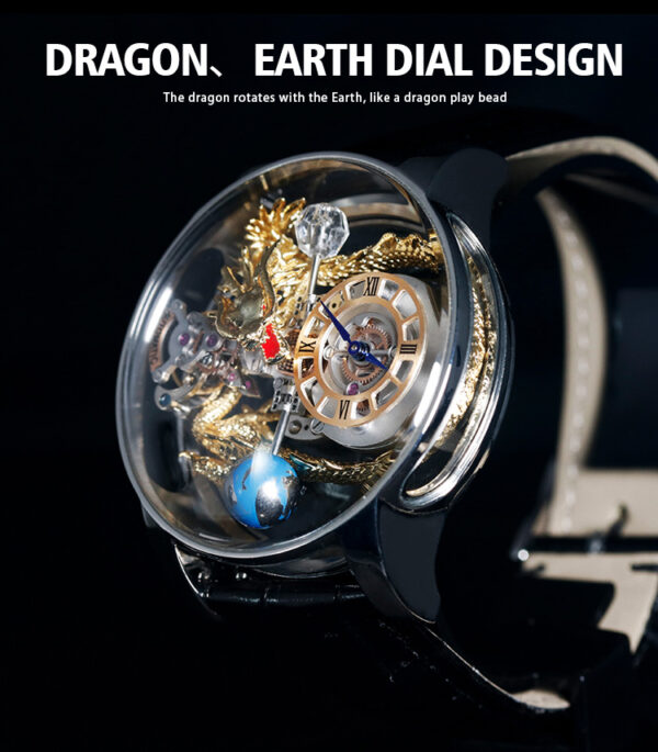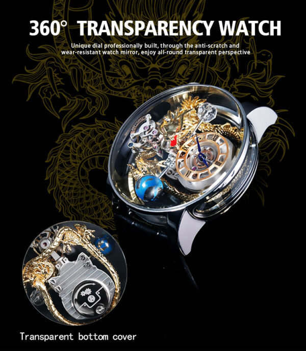 The Chinese element of dragon is added to make this watch more vivid and specific. The large dial has a transparent bottom cover, so you can clearly see the movement of the parts inside.