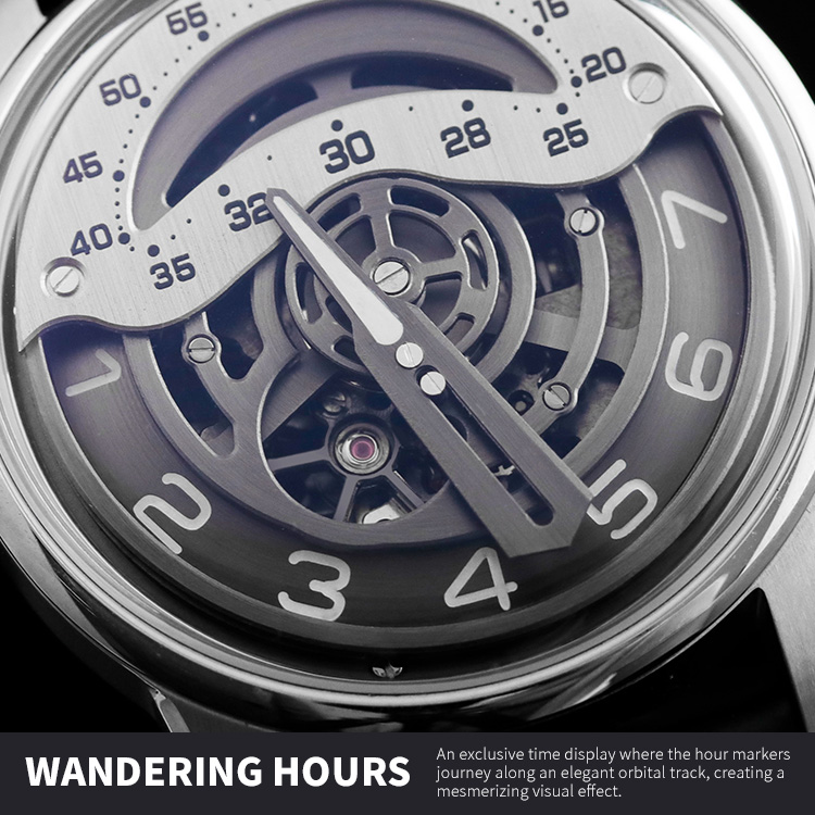 The dial, aglow with golden radiance, boasts intricate cutouts that unveil the inner workings of the movement, showcasing its intricate structure. The telescoping motion in the golden arc elegantly marks the minutes, while the large hour numerals, encircled by a dark area, offer a unique wandering hour function for effortless time reading.