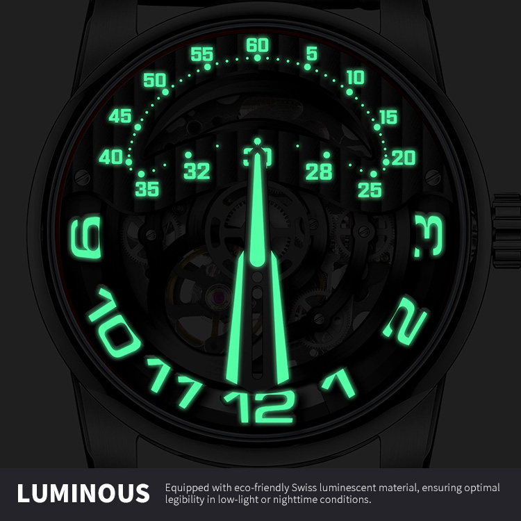 Enhancing readability, luminous markers illuminate the dial for clear visibility in low-light conditions. Moreover, this timepiece allows for customization, enabling you to personalize the watch with your own logo and additional functions, making each piece a reflection of your distinctive style and preferences.