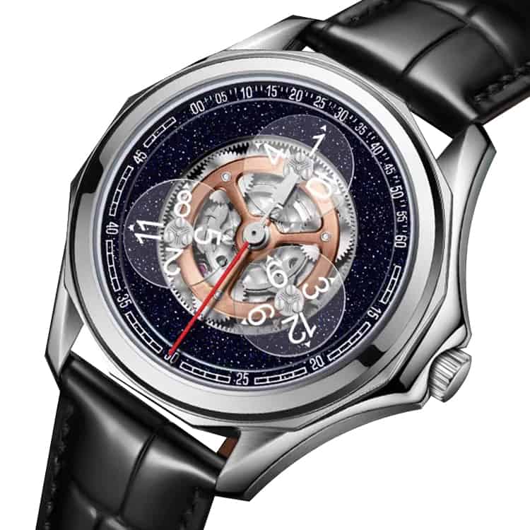 Introducing a mesmerizing mechanical watch with a starry dial, featuring three rotating discs. The blue gold sand background showcases the vastness of the universe at night, with the Milky Way scattered across the sky, guiding our way forward. The two hands represent the moon’s and stars’ orbits, and the twelve constellations constantly rotate, capturing lucky moments. With a scratch-resistant sapphire glass, transparent bottom cover, and 50m water resistance, this watch combines beauty, functionality, and durability. Perfect for daily wear, including rainy days and washing.