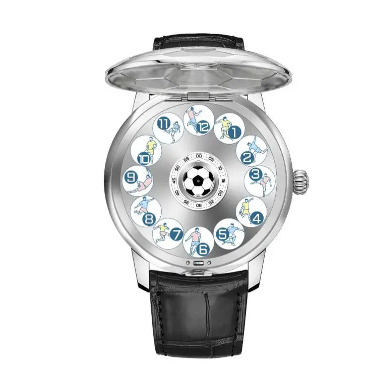 Once you open the cover, the full “Arena Dial” becomes visible. We placed a miniature football at the center to serve as the visual core. Around it, an inner rotating ring tracks minutes and seconds from 00 to 60. As a result, the time flows smoothly and continuously even while the hour disc performs its dramatic jump.