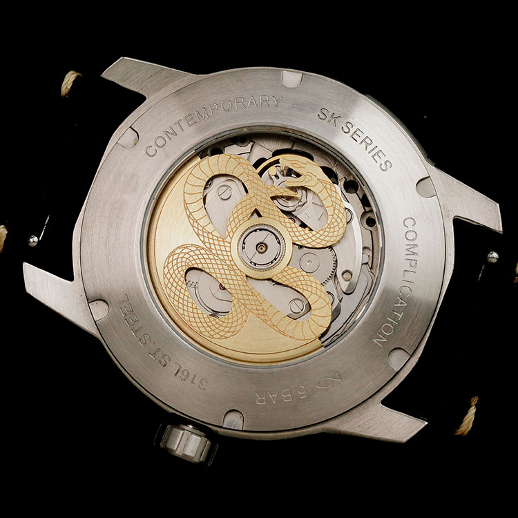 Yet the mechanics refuse to remain silent. The skeletonized core asserts its presence with purpose. Two gear-shaped discs actively display hours and minutes, their precise rotation cutting through the serpent’s organic curves. In contrast, Eastern mythology’s sacred totem collides with the disciplined order of Western horology. Warm enamel and delicate micro-sculpture meet polished stainless steel, tactile crocodile leather, and the raw geometry of exposed gears. As a result, tension becomes harmony, and symbolism transforms into motion.
