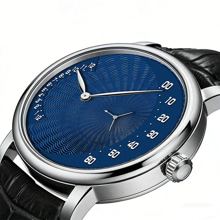 The Wabi-Sabi Retrograde Watch embodies this philosophy of imperfection and tranquility. Inspired by the Japanese aesthetic of wabi-sabi—finding beauty in simplicity and transience—it features a serene silver dial with almost no markings. Gentle sunburst guilloché patterns ripple outward like soft lake waves, catching light in quiet, shifting brilliance. Slender silk-thin hands glide across the empty canvas, interrupted only by the solitary “31” at 12 o’clock—an unfinished sentence that invites personal interpretation.