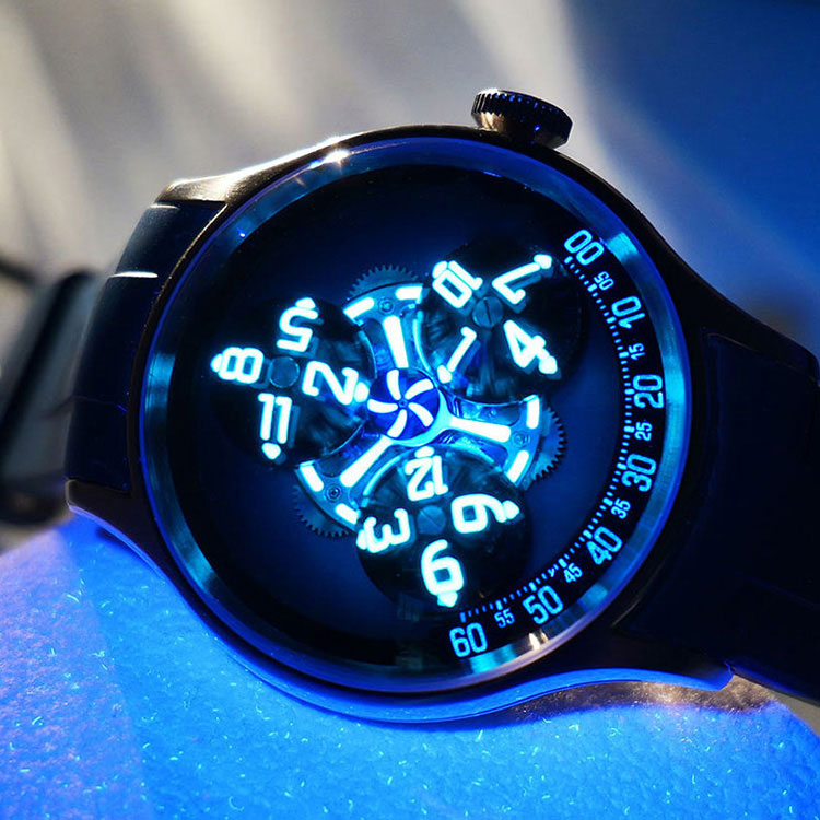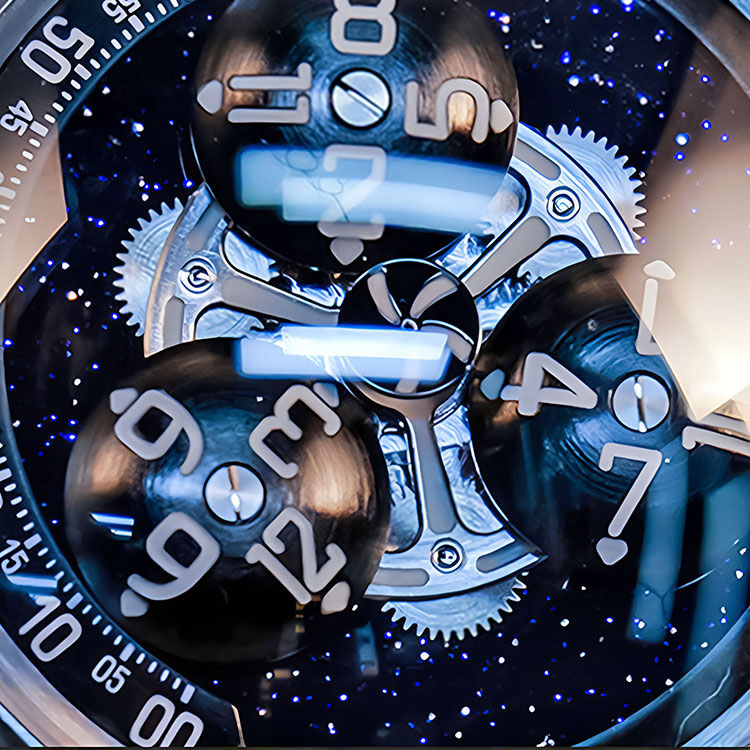 The dial features a domed synthetic blue sapphire crystal that gives the watch a deep, layered look. Beneath it, a starry blue background with subtle gradient effects creates a sense of infinite space. Three rotating discs display hours— each numeral floats and shifts in a dynamic, orbital pattern that feels alive and slightly unpredictable, just like the three-body gravitational dance in the novel.