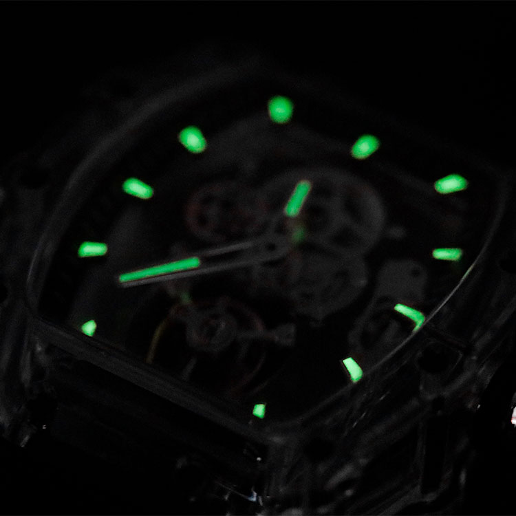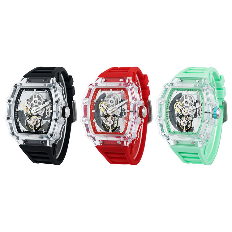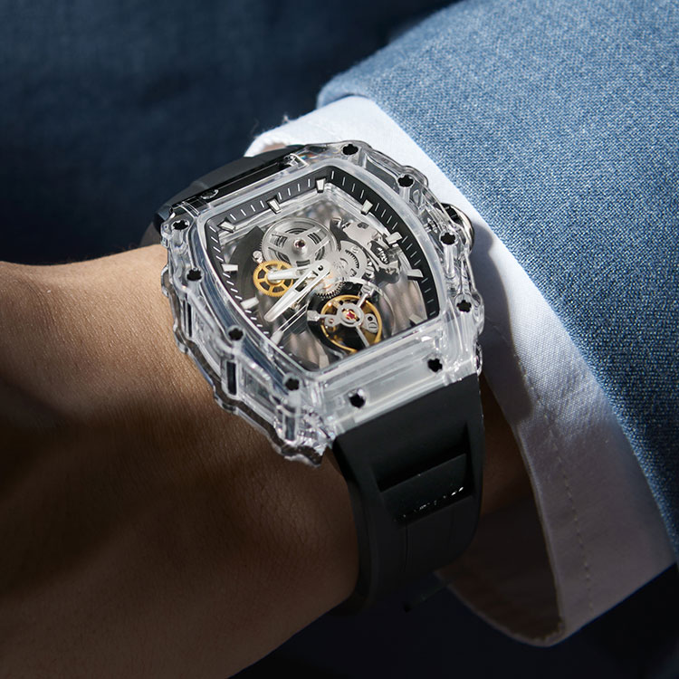 To match the transparent aesthetic, the watch pairs with a segmented industrial-style rubber strap. It offers structure, grip, and comfort, while riveted case screws strengthen the overall engineering character. The open-worked movement stays fully visible, transforming every motion into a mechanical performance.
