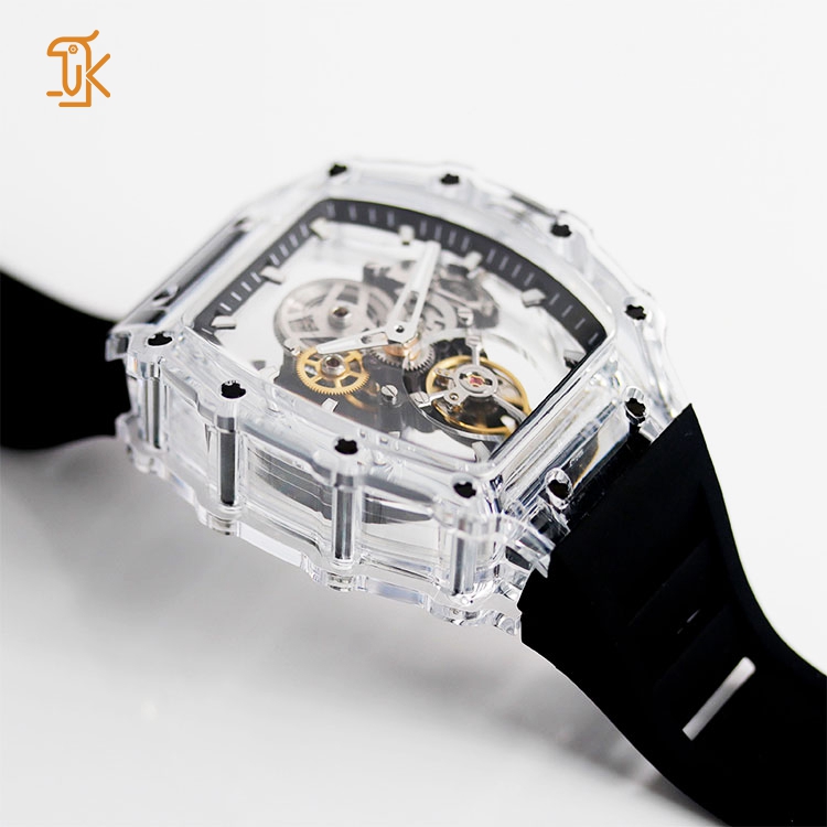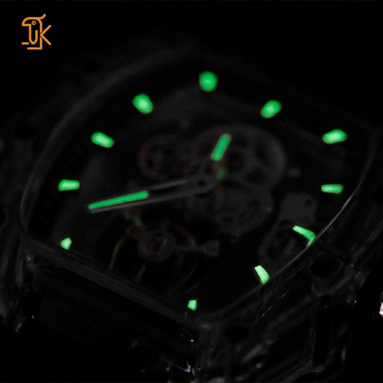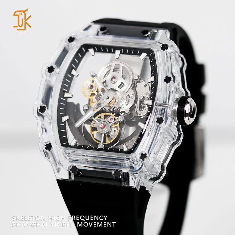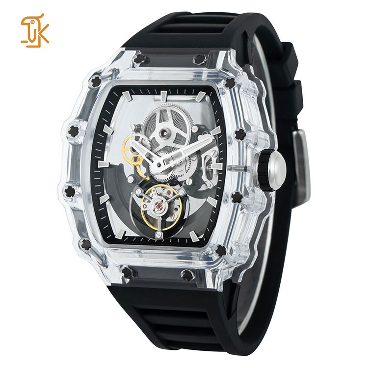 The transparent barrel-shaped case showcases the intricate workings of the movement, allowing you to appreciate the beauty of mechanical engineering in action. With luminous hour markers, this watch ensures visibility in low light, combining elegance with practicality.