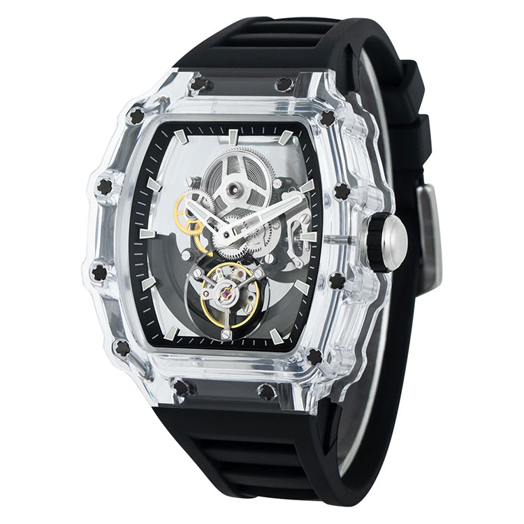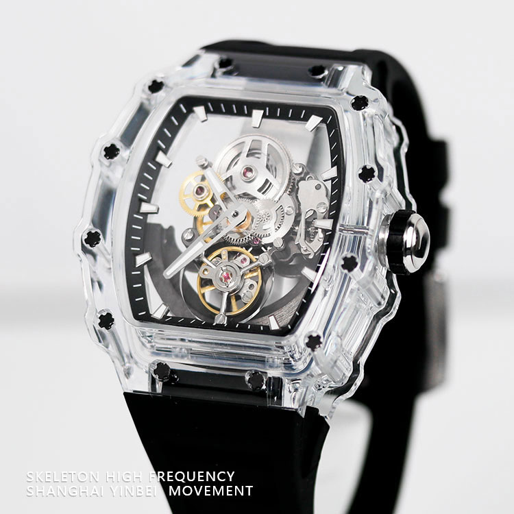The transparent barrel-shaped case showcases the intricate workings of the movement, allowing you to appreciate the beauty of mechanical engineering in action.