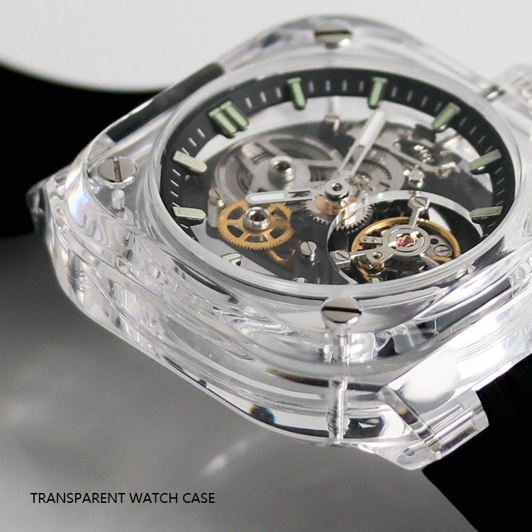 This artistic transparent square mechanical watch reflects our long-standing pursuit of mechanical architecture and geometric aesthetics. The square K9 glass case is purpose-built to reveal the movement within, allowing light to flow freely through the structure and turning every moment into a visible mechanical experience.