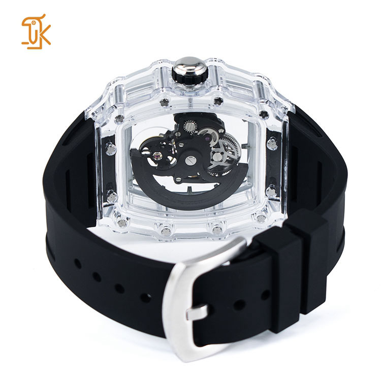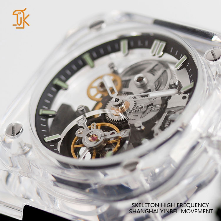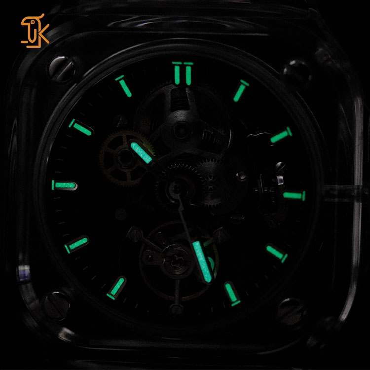 The transparent square case, reminiscent of a mystical shopwindow, invites admiration. Its crystal-clear design unveils the mesmerizing dance of gears and springs, transforming wristwear into a wearable gallery of mechanical artistry. Luminous indexes pierce through darkness, marrying practicality with a touch of intrigue for boardrooms or evening affairs.