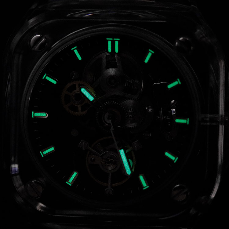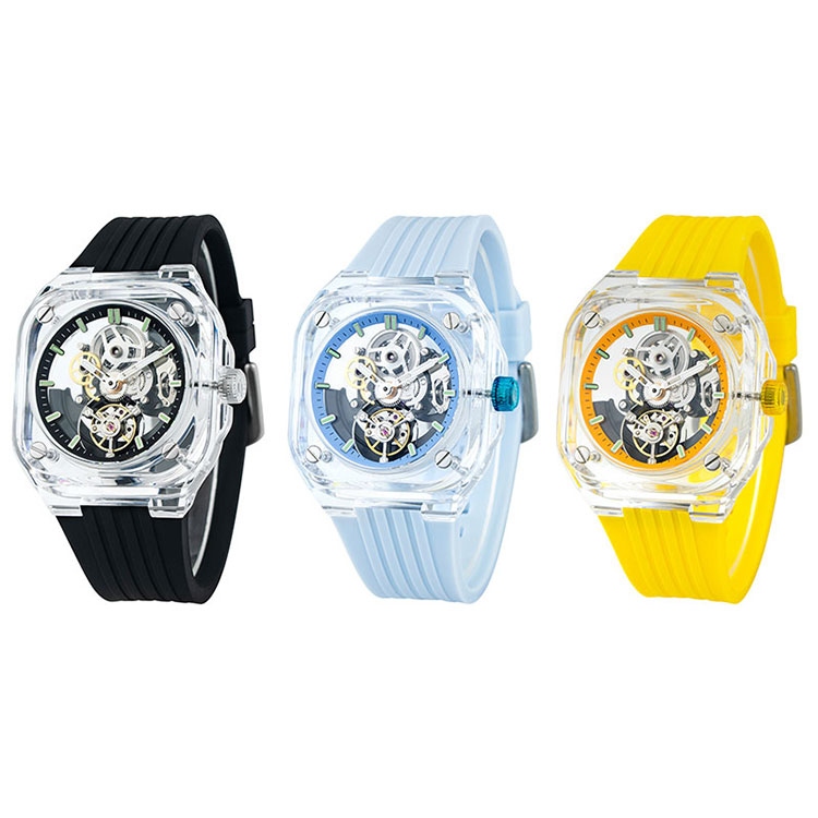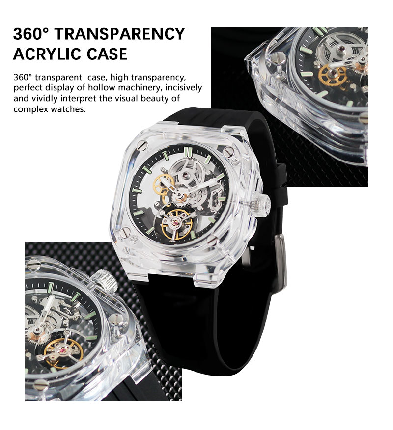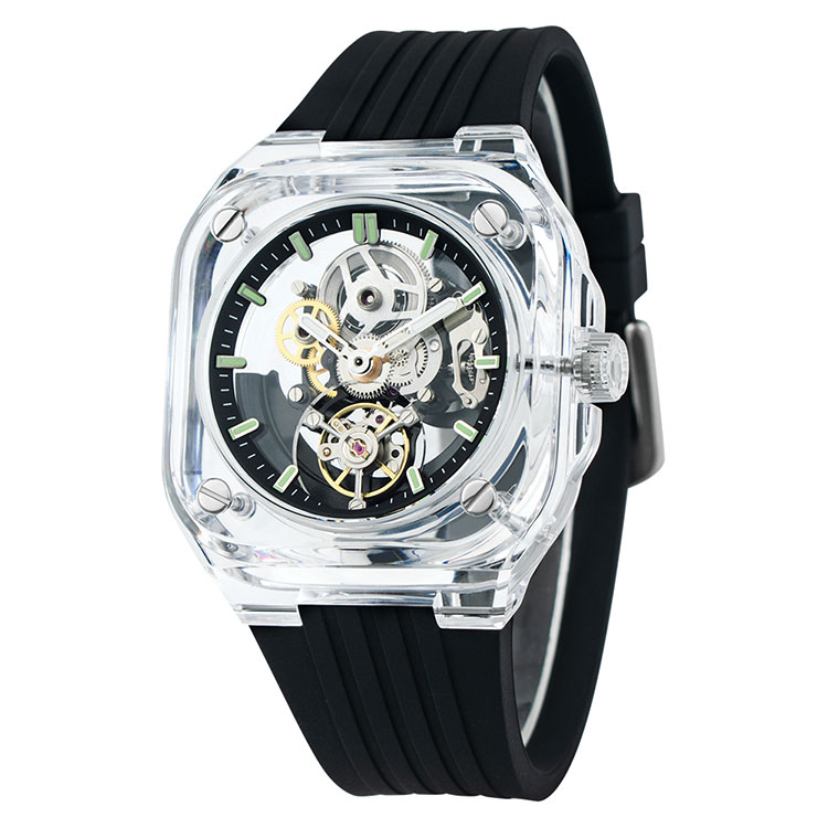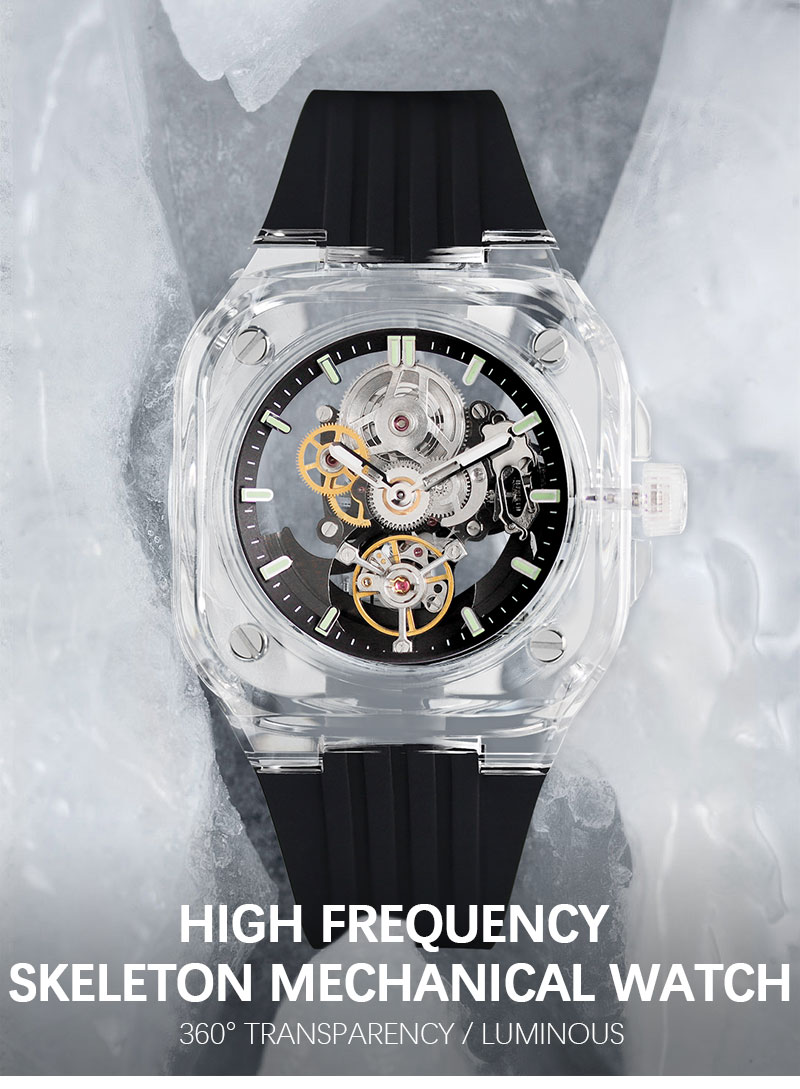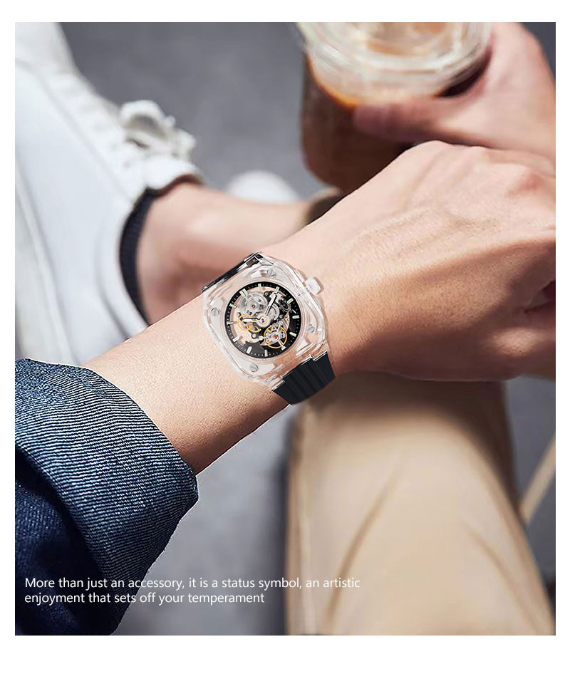 This artistic transparent square mechanical watch reflects our long-standing pursuit of mechanical architecture and geometric aesthetics. The square K9 glass case is purpose-built to reveal the movement within, allowing light to flow freely through the structure and turning every moment into a visible mechanical experience.