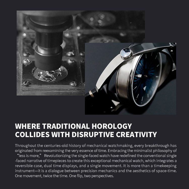 Crafted for true watch enthusiasts, this timepiece houses the reliable Miyota 8215 movement within a finely forged stainless steel round case. Its unique 360-degree reversible reading function elevates traditional timekeeping into a captivating experience, merging mechanical ingenuity with refined design.