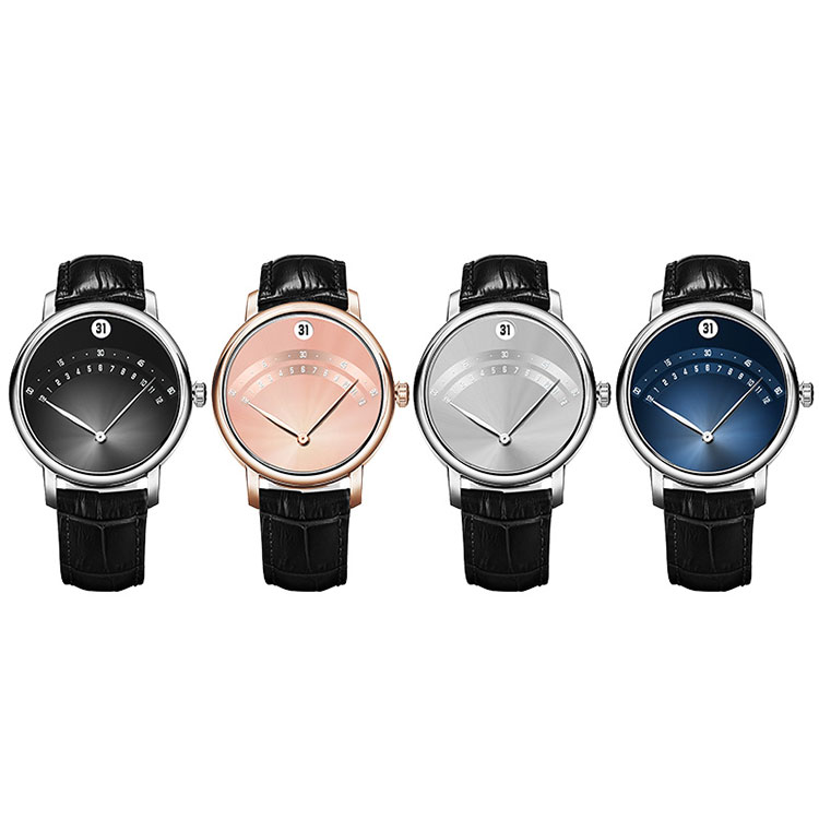 This philosophy lives within the mechanics. Powered by a customized Miyota 8215 with an in-house retrograde module, the coaxial hour and minute hands sweep across fan-shaped arcs, then jump back with graceful precision. A central seconds hand keeps motion alive, while the 12 o’clock date aperture anchors each day. Slimmed beneath curved sapphire glass, the design balances clarity and depth.