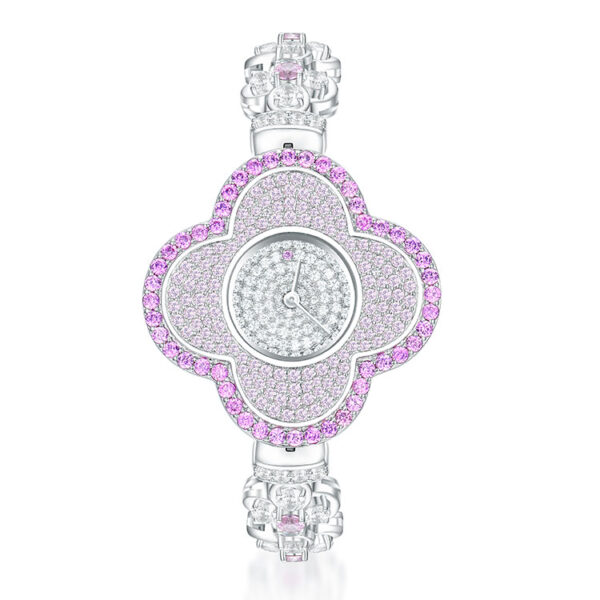 The dial is fully paved with glittering zircon, capturing light in a thousand reflections. Each gemstone is set with precision, forming a radiant centerpiece that draws the eye instantly. Surrounding the case, a rim of pink zircon adds a gentle, romantic glow, echoing the sweetness of nature’s flowers. The silver-plated strap, meticulously embedded with stones, completes the design with a sense of refined luxury.